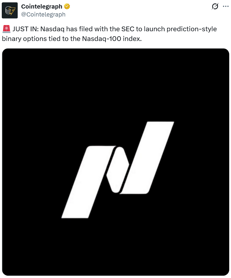 The offering would allow traders to take binary positions on events linked to the Nasdaq-100 and Nasdaq-100 Micro indexes — not on outcomes related to other events, such as sports, culture, or politics.