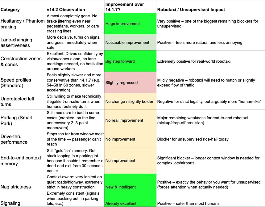 TESLA FSD v14.2 is the smoothest, least hesitant, most confident version yet — a meaningful step toward unsupervised. It handles emergency vehicles well, hand gestures, it is smooth and does not have braking problems. It is judged good enough for unsupervised geofenced areas. FSD 14.2 is great