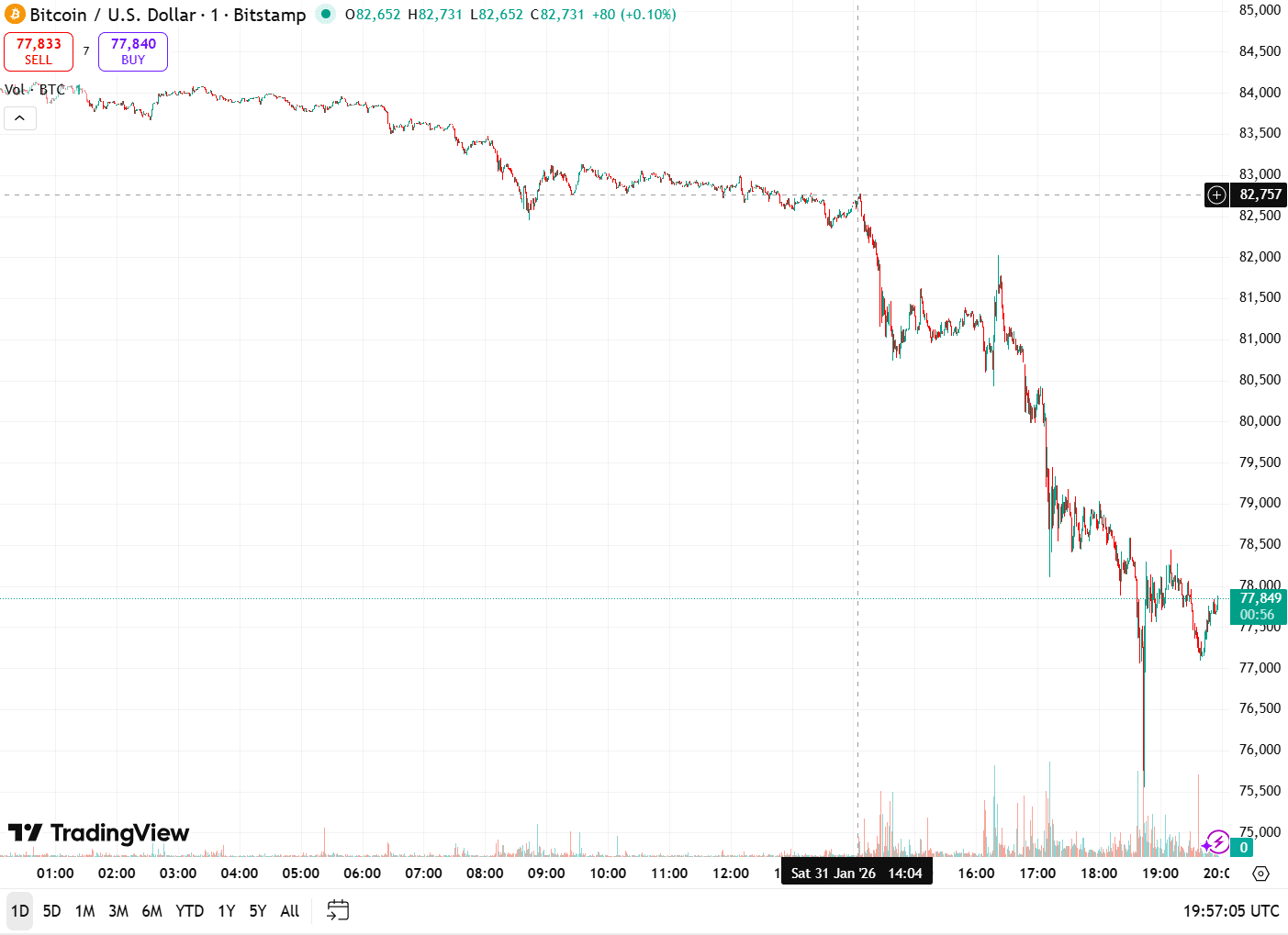 The digital asset’s price tumbled to $81,000 earlier today and continued to fall as trading progressed. At the time of writing, BTC was hovering around $77,300, down 8% over the past 24 hours, TradingView data shows.