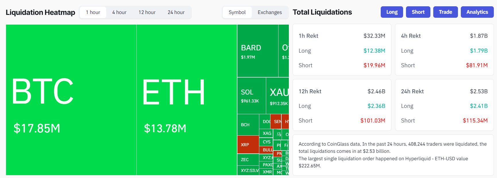 Long traders bore the brunt of the losses at $2.4 billion, while more than 408,000 traders were liquidated.