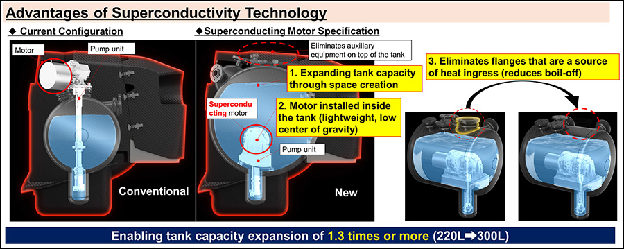 Toyota is also continuing to develop superconductivity technology to expand the potential of liquid hydrogen technology, and has reached the stage where vehicles can run with a superconducting pump installed inside the fuel tank. Installing a highly efficient, compact superconducting motor inside the tank creates space that can help achieve more than a 1.3-fold increase in tank capacity, leading to improved cruising range. Additionally, improvements in driving performance through reduced weight and a lower center of gravity, as well as a reduction in boil-off*1 volume by eliminating the flange*2 as a heat input source, can be expected.